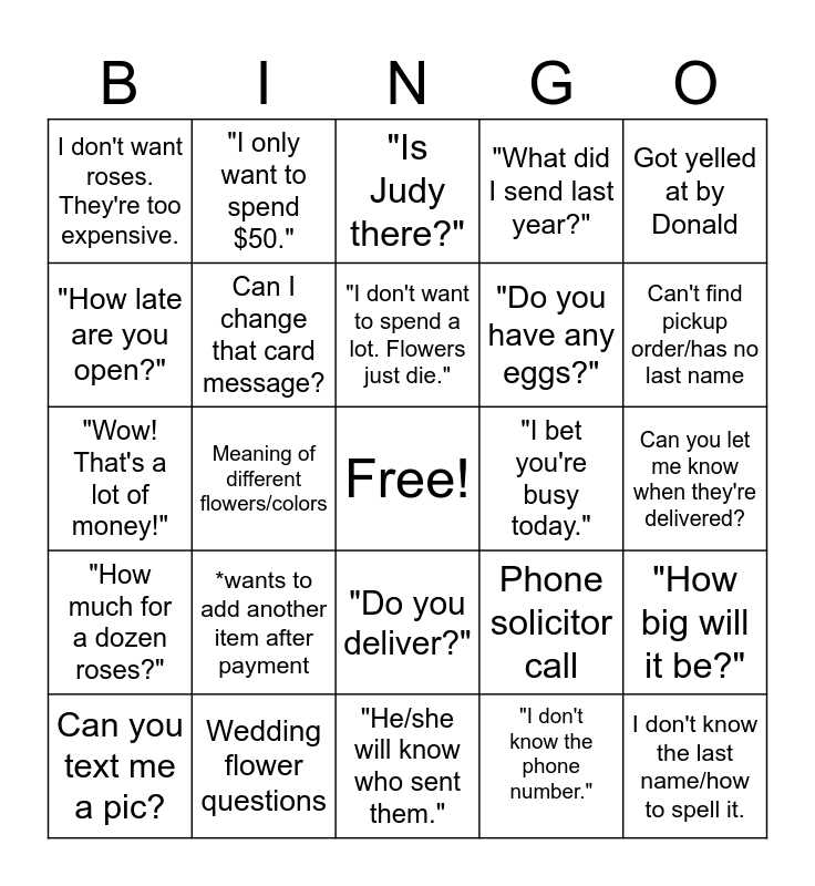 This bingo card has a free space and 29 words: Can you text me a pic?, Make it pretty/special, Meaning of different flowers/colors, "Oh wait-I have to find my card.", I don't want roses. They're too expensive., "Is Judy there?", Can I change that card message?, *wants to add another item after payment, "I bet you're busy today.", Wedding flower questions, Can you let me know when they're delivered?, I don't know the last name/how to spell it., "He/she will know who sent them.", "I don't know the phone number.", Can't find pickup order/has no last name, Wants something we've never heard of, "Do you deliver?", "How much for a dozen roses?", Got yelled at by Donald, "Wow! That's a lot of money!", Phone solicitor call, "I didn't think about how I wanted the card signed.", "Do you have any eggs?", "How late are you open?", "What did I send last year?", "I only want to spend $50.", "How big will it be?", "I don't want to spend a lot. Flowers just die." and "Were my flowers delivered? I didn't hear from them..