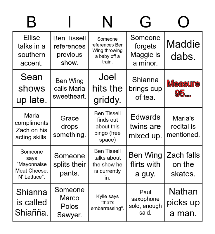 This bingo card has a free space and 49 words: Ben Wing and Maria flirt., Nathan picks up a man., Cuss word isn't censored., Kylie says "that's embarrassing"., Someone splits their pants., Ellie brings coffee to rehearsal., Ben Tissell references previous show., Em mentions APO., Sean shows up late., Methan pulls an all-nighter., Ben Wing calls Maria sweetheart., Someone forgets Maggie is a minor., Zach falls on the skates., Ben Wing flirts with a guy., Zach and Kolby pretend to kiss., Hudson wears crocs., Joel hits the griddy., Edwards twins are mixed up., Corrine comes late from cheer., Maddie dabs., Grace drops something., Paul saxophone solo, enough said., Ellise talks in a southern accent., Shianna brings cup of tea., Mack dances to I'm free., Measure 95..., Shianna is called Shiañña., Someone pokes Shianna., Ben Tissell talks about the show he is currently in., Someone says "Mayonnaise Meat Cheese, N' Lettuce"., Someone sings "La da da da da da da da"., Someone says "Sandwiches SNadwiches"., Someone says "Stop! Go! Yield! Turn!", Zach compliments Maria on her piano skills., Someone Marco Polos Sawyer., Someone calls CJ., Fly By Night is mentioned., Pride and Prejudice is mentioned., Maria's recital is mentioned., Someone brings a longboard., Ben Tissell wears his beer socks., Someone asks Ben Tissell if he is a turtle too., Someone does something rad in honor of CJ., Someone asks Shianna about the puking turkey., Maria compliments Zach on his acting skills., Someone references Ben Wing throwing a baby off a train., Someone brings up Noah Keener's 10 10 10 play, A Higher Power., Someone taps Ben Tissell without him knowing. and Someone starts a game of tag..