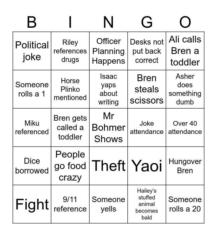 This bingo card has a free space and 29 words: Fight, Asher falls asleep, Bren gets called a toddler, Ali does something dumb, Political joke, Officer Planning Happens, Horse Plinko mentioned, People go food crazy, Joke attendance, 9/11 reference, Over 40 attendance, Someone rolls a 20, Someone yells, Hailey’s stuffed animal becomes bald, Asher does something dumb, Joke question, Theft, Dice borrowed, Ali calls Bren a toddler, Miku referenced, Yaoi, Yuri, Bren steals scissors, Someone rolls a 1, Desks not put back correct, Riley references drugs, Hungover Bren, Isaac yaps about writing and Sanuja Shows up.