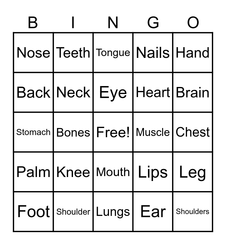 This bingo card has a free space and 24 words: Knee, Shoulder, Eye, Foot, Hand, Nose, Back, Teeth, Muscle, Mouth, Heart, Stomach, Lips, Leg, Neck, Ear, Chest, Tongue, Brain, Bones, Shoulders, Palm, Nails and Lungs.