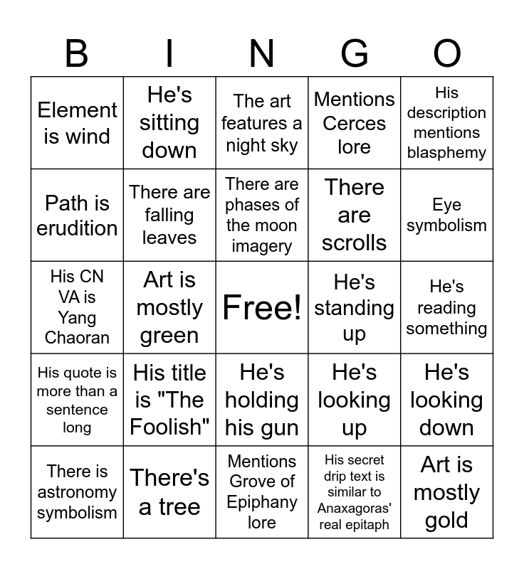 This bingo card has a free space and 24 words: His title is "The Foolish", There's a tree, There are phases of the moon imagery, There is astronomy symbolism, His description mentions blasphemy, Element is wind, Path is erudition, He's sitting down, He's standing up, He's holding his gun, There are scrolls, His CN VA is Yang Chaoran, He's looking up, He's looking down, There are falling leaves, His secret drip text is similar to Anaxagoras' real epitaph, He's reading something, The art features a night sky, Eye symbolism, Art is mostly green, Art is mostly gold, His quote is more than a sentence long, Mentions Cerces lore and Mentions Grove of Epiphany lore.
