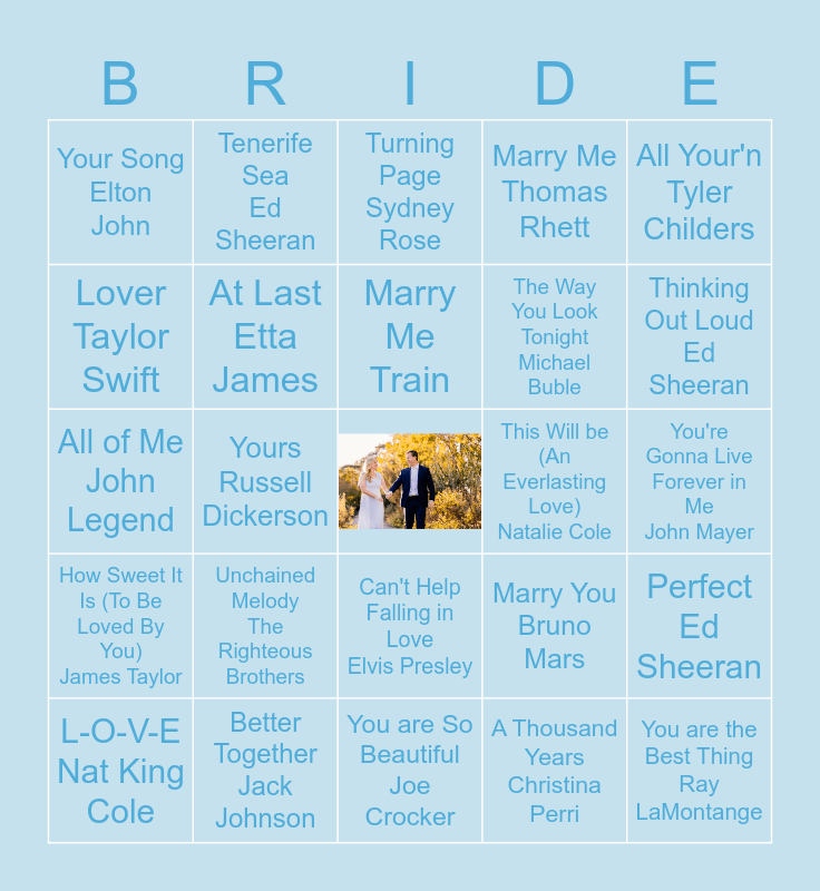 This bingo card has a free space and 30 words: Better Together Jack Johnson, Baby I'm Yours Arctic Monkeys, Yours Russell Dickerson, Make You Feel My Love Adele, Your Song Elton John, Turning Page Sydney Rose, At Last Etta James, Can't Help Falling in Love Elvis Presley, This Will be (An Everlasting Love) Natalie Cole, You are So Beautiful Joe Crocker, You're Gonna Live Forever in Me John Mayer, You are the Best Thing Ray LaMontange, A Thousand Years Christina Perri, I Will Always Love You Whitney Houston, Thinking Out Loud Ed Sheeran, Better Together Luke Combs, Marry You Bruno Mars, How Sweet It Is (To Be Loved By You) James Taylor, Unchained Melody The Righteous Brothers, All Your'n Tyler Childers, All of Me John Legend, I Get to Love You Ruelle, Tenerife Sea Ed Sheeran, The Way You Look Tonight Michael Buble, Lover Taylor Swift, Marry Me Thomas Rhett, Perfect Ed Sheeran, L-O-V-E Nat King Cole, Marry Me Train and I Got Away with You Luke Combs.