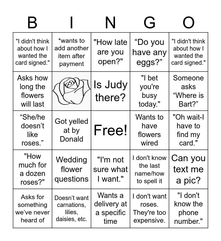 This bingo card has 2 images, a free space and 24 words: "I'm not sure what I want.", I don't want roses. They're too expensive., Is Judy there?, Doesn’t want carnations, lilies, daisies, etc., "I didn't think about how I wanted the card signed.", "I didn't think about how I wanted the card signed.", Asks how long the flowers will last, *wants to add another item after payment, "Oh wait-I have to find my card.", I don't know the last name/how to spell it, "I bet you're busy today.", “She/he doesn’t like roses.”, Can you text me a pic?, Asks for something we’ve never heard of, Got yelled at by Donald, "Were my flowers delivered? I didn't hear from them, “Do you have any eggs?”, "How much for a dozen roses?", "How late are you open?", "I don't know the phone number.", Someone asks “Where is Bart?”, Wants a delivery at a specific time, Wants to have flowers wired and Wedding flower questions.