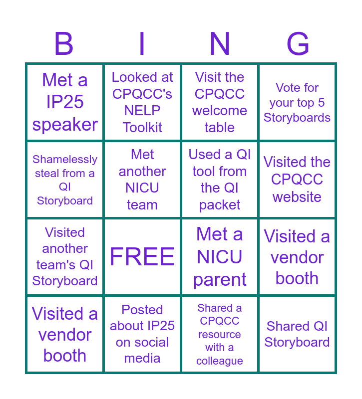 This bingo card has 16 words: Posted about IP25 on social media, Visited a vendor booth, Visit the CPQCC welcome table, Met a IP25 speaker, Visited another team's QI Storyboard, Looked at CPQCC's NELP Toolkit, Met a NICU parent, Shared a CPQCC resource with a colleague, Shamelessly steal from a QI Storyboard, Met another NICU team, Visited a vendor booth, Vote for your top 5 Storyboards, FREE, Visited the CPQCC website, Used a QI tool from the QI packet and Shared QI Storyboard.