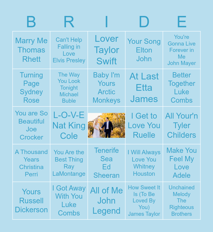 This bingo card has a free space and 30 words: I Got Away With You Luke Combs, Marry Me Train, L-O-V-E Nat King Cole, Perfect Ed Sheeran, Marry Me Thomas Rhett, Lover Taylor Swift, The Way You Look Tonight Michael Buble, Tenerife Sea Ed Sheeran, I Get to Love You Ruelle, All of Me John Legend, All Your'n Tyler Childers, Unchained Melody The Righteous Brothers, How Sweet It Is (To Be Loved By You) James Taylor, Marry You Bruno Mars, Better Together Luke Combs, Thinking Out Loud Ed Sheeran, I Will Always Love You Whitney Houston, A Thousand Years Christina Perri, You Are the Best Thing Ray LaMontange, You're Gonna Live Forever in Me John Mayer, You are So Beautiful Joe Crocker, This Will be (An Everlasting Love) Natalie Cole, Can't Help Falling in Love Elvis Presley, At Last Etta James, Turning Page Sydney Rose, Your Song Elton John, Make You Feel My Love Adele, Yours Russell Dickerson, Baby I'm Yours Arctic Monkeys and Better Together Jack Johnson.
