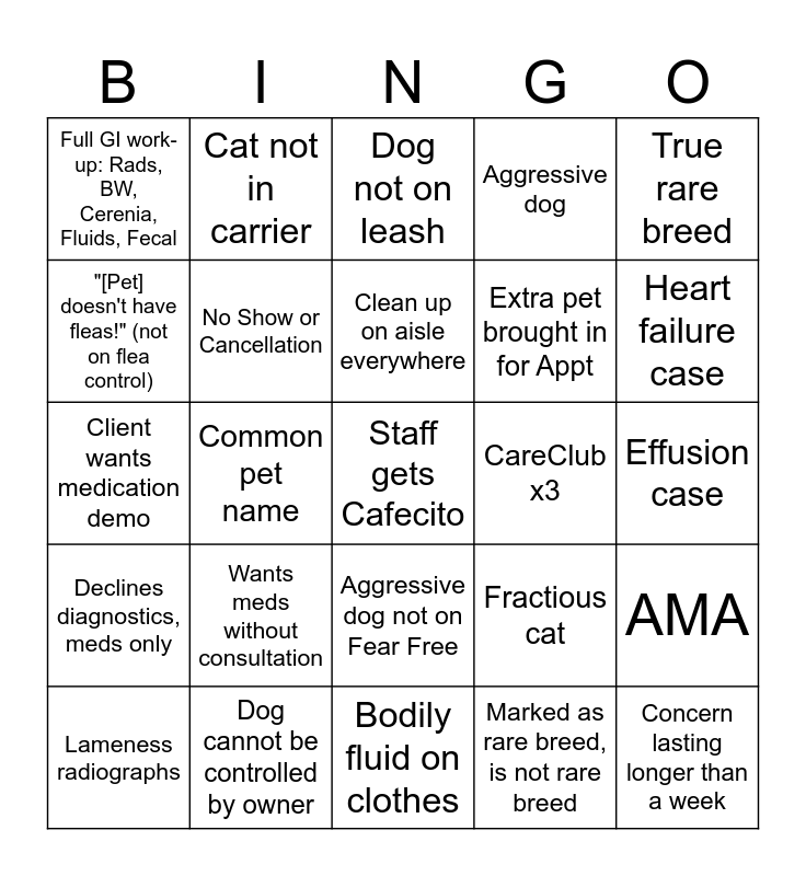 This bingo card has a free space and 24 words: Wants meds without consultation, Dog cannot be controlled by owner, Clean up on aisle everywhere, Lameness radiographs, True rare breed, Full GI work-up: Rads, BW, Cerenia, Fluids, Fecal, "[Pet] doesn't have fleas!" (not on flea control), Cat not in carrier, CareClub x3, Aggressive dog not on Fear Free, Extra pet brought in for Appt, Client wants medication demo, Fractious cat, AMA, No Show or Cancellation, Marked as rare breed, is not rare breed, Effusion case, Dog not on leash, Heart failure case, Common pet name, Concern lasting longer than a week, Declines diagnostics, meds only, Aggressive dog and Bodily fluid on clothes.
