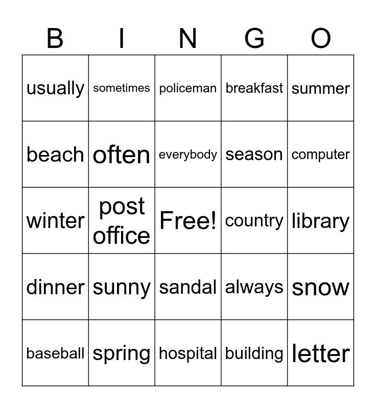 This bingo card has a free space and 24 words: sunny, spring, everybody, baseball, summer, usually, beach, sometimes, country, sandal, season, winter, always, snow, often, building, library, policeman, computer, post office, letter, dinner, breakfast and hospital.