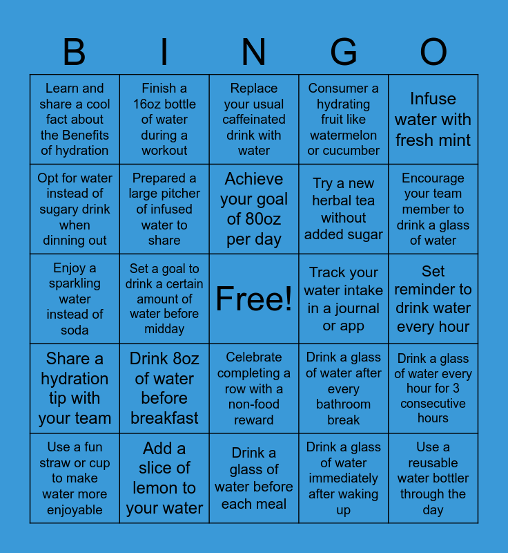 This bingo card has a free space and 24 words: Drink 8oz of water before breakfast, Add a slice of lemon to your water, Achieve your goal of 80oz per day, Use a fun straw or cup to make water more enjoyable, Infuse water with fresh mint, Learn and share a cool fact about the Benefits of hydration, Opt for water instead of sugary drink when dinning out, Finish a 16oz bottle of water during a workout, Track your water intake in a journal or app, Celebrate completing a row with a non-food reward, Try a new herbal tea without added sugar, Enjoy a sparkling water instead of soda, Drink a glass of water after every bathroom break, Drink a glass of water every hour for 3 consecutive hours, Prepared a large pitcher of infused water to share, Drink a glass of water immediately after waking up, Set reminder to drink water every hour, Replace your usual caffeinated drink with water, Encourage your team member to drink a glass of water, Set a goal to drink a certain amount of water before midday, Use a reusable water bottler through the day, Share a hydration tip with your team, Consumer a hydrating fruit like watermelon or cucumber and Drink a glass of water before each meal.