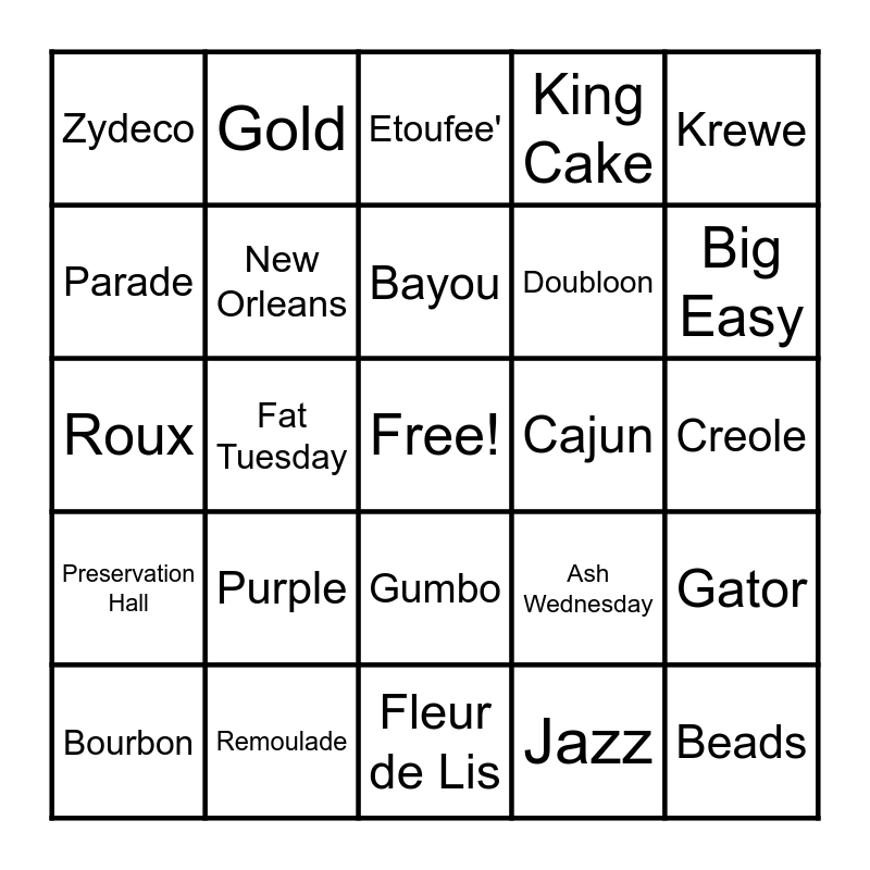 This bingo card has a free space and 50 words: Drawl, Beads, Mask, Fleur de Lis, Purple, Green, Gold, Muffaletta, Parade, Po'Boy, New Orleans, King Cake, Gator, Ash Wednesday, Bacchus, Saxophone, Bayou, Cajun, Float, Krewe, Fat Tuesday, Jazz, Zydeco, Doubloon, Carnival, Hurricane, Big Easy, Masquerade, Etoufee', Gumbo, Voo Doo, Jambalaya, Crawfish, Sha, Remoulade, Beignets, Holy Trinity, Tony Chachere, Pat O'Brien, Creole, Throws, Baby, Jester, Daiquiri, Bourbon, Roux, French Quarter, Jackson Square, Preservation Hall and Hush Puppy.