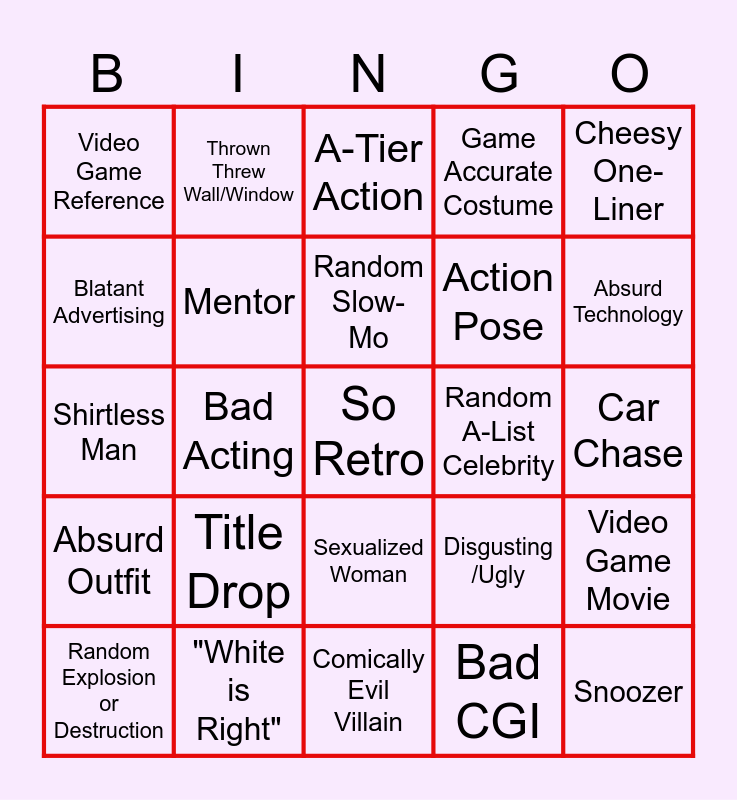 This bingo card has a free space and 24 words: Title Drop, "White is Right", Random Slow-Mo, Random Explosion or Destruction, Cheesy One-Liner, Video Game Reference, Blatant Advertising, Thrown Threw Wall/Window, Random A-List Celebrity, Sexualized Woman, Action Pose, Shirtless Man, Disgusting /Ugly, Video Game Movie, Mentor, Bad CGI, Car Chase, A-Tier Action, Absurd Technology, Bad Acting, Snoozer, Absurd Outfit, Game Accurate Costume and Comically Evil Villain.