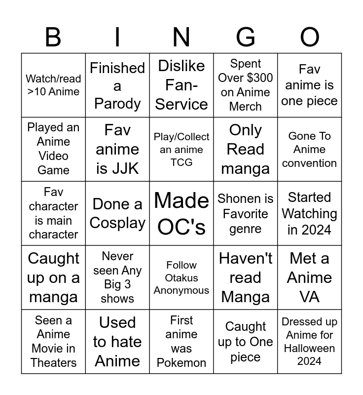 This bingo card has a free space and 24 words: Never seen Any Big 3 shows, Used to hate Anime, Play/Collect an anime TCG, Seen a Anime Movie in Theaters, Fav anime is one piece, Watch/read >10 Anime, Played an Anime Video Game, Finished a Parody, Shonen is Favorite genre, Follow Otakus Anonymous, Only Read manga, Fav character is main character, Haven't read Manga, Met a Anime VA, Fav anime is JJK, Caught up to One piece, Started Watching in 2024, Dislike Fan-Service, Gone To Anime convention, Done a Cosplay, Dressed up Anime for Halloween 2024, Caught up on a manga, Spent Over $300 on Anime Merch and First anime was Pokemon.