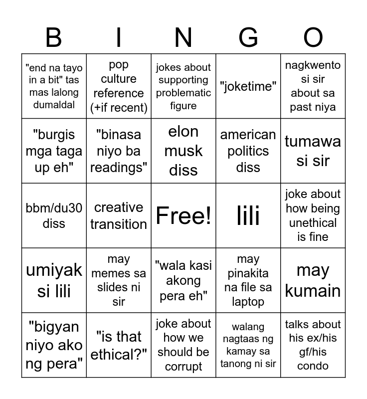 This bingo card has a free space and 24 words: "bigyan niyo ako ng pera", may memes sa slides ni sir, elon musk diss, walang nagtaas ng kamay sa tanong ni sir, nagkwento si sir about sa past niya, "end na tayo in a bit" tas mas lalong dumaldal, pop culture reference (+if recent), jokes about supporting problematic figure, lili, joke about how being unethical is fine, bbm/du30 diss, "binasa niyo ba readings", may pinakita na file sa laptop, may kumain, "burgis mga taga up eh", "is that ethical?", joke about how we should be corrupt, "joketime", tumawa si sir, umiyak si lili, creative transition, "wala kasi akong pera eh", american politics diss and talks about his ex/his gf/his condo.