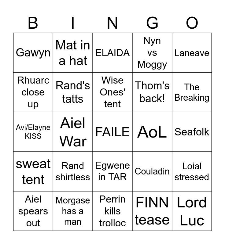 This bingo card has a free space and 24 words: Rand shirtless, Morgase has a man, Wise Ones' tent, Aiel spears out, Laneave, Gawyn, Rhuarc close up, Mat in a hat, AoL, Egwene in TAR, Thom's back!, Avi/Elayne KISS, Couladin, Loial stressed, Rand's tatts, FINN tease, Seafolk, ELAIDA, The Breaking, Aiel War, Lord Luc, sweat tent, Nyn vs Moggy and Perrin kills trolloc.