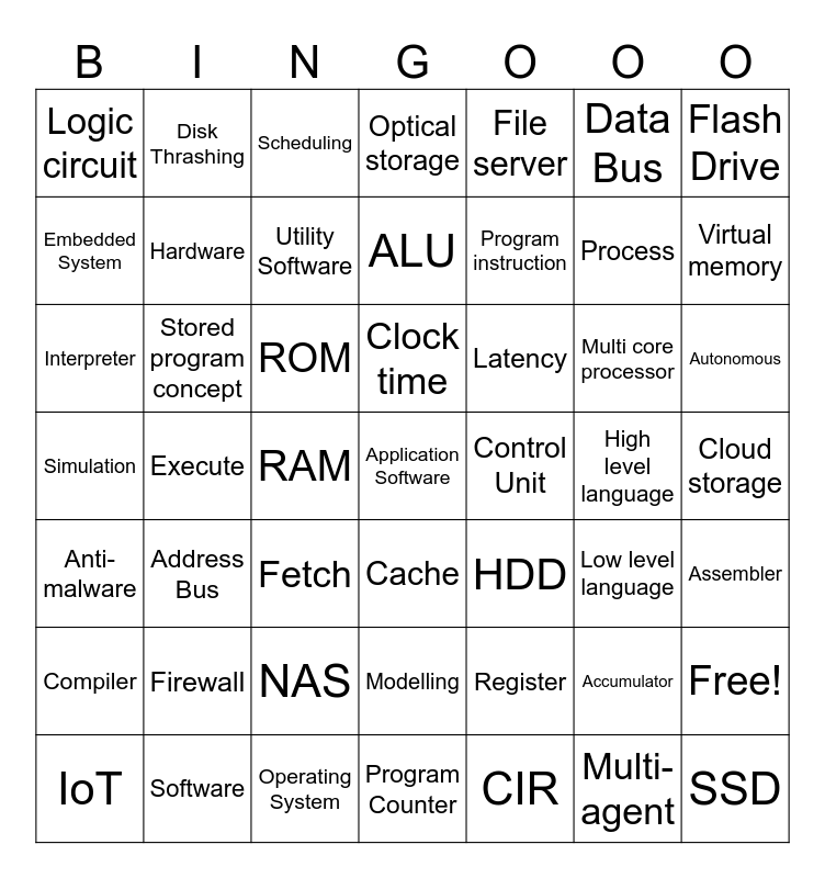 This bingo card has 50 words: Free!, Process, Multi- agent, Execute, ROM, Cache, Disk Thrashing, Program Counter, Data Bus, HDD, Flash Drive, Optical storage, Multi core processor, Latency, NAS, Cloud storage, Embedded System, Virtual memory, IoT, File server, Program instruction, RAM, Logic circuit, Hardware, Software, Application Software, Utility Software, Operating System, Scheduling, Clock time, Defragmentation, Anti- malware, Firewall, Modelling, Simulation, High level language, Low level language, Assembler, Compiler, Interpreter, Fetch, Register, Address Bus, CIR, Autonomous, ALU, Control Unit, Accumulator, Stored program concept and SSD.