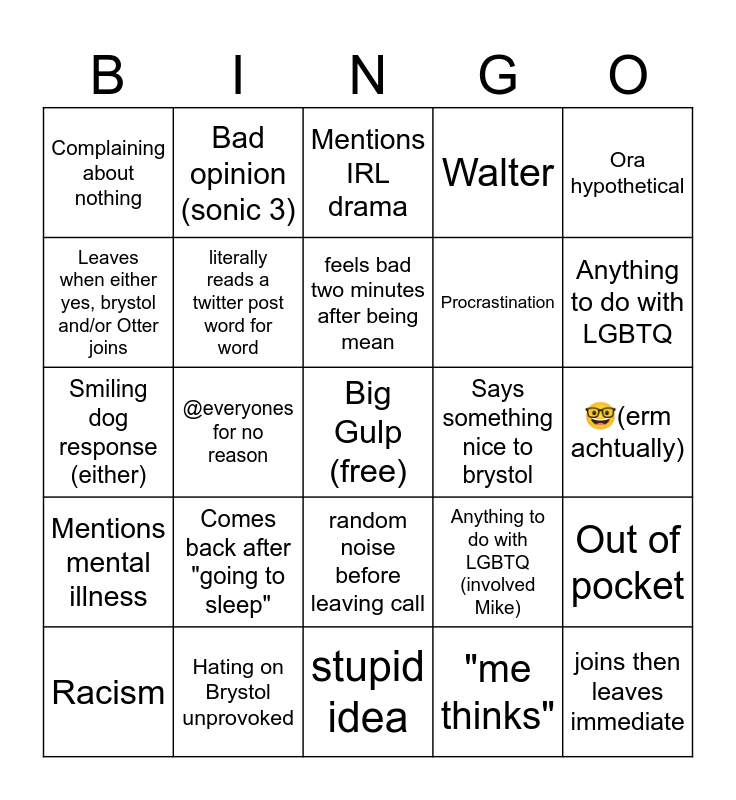 This bingo card has a free space and 24 words: Comes back after "going to sleep", Hating on Brystol unprovoked, feels bad two minutes after being mean, Racism, Ora hypothetical, Complaining about nothing, Leaves when either yes, brystol and/or Otter joins, Bad opinion (sonic 3), Says something nice to brystol, random noise before leaving call, Procrastination, Smiling dog response (either), Anything to do with LGBTQ (involved Mike), Out of pocket, literally reads a twitter post word for word, "me thinks", 🤓(erm achtually), Mentions IRL drama, Anything to do with LGBTQ, @everyones for no reason, joins then leaves immediate, Mentions mental illness, Walter and stupid idea.