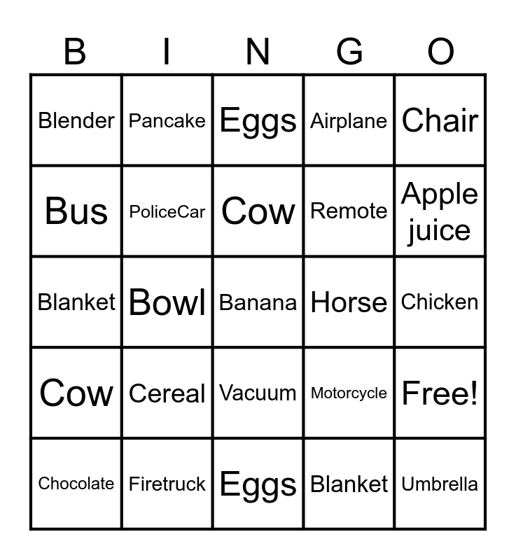 This bingo card has 51 words: Apple juice, Banana, Chocolate, Eggs, Cereal, Icecream, Pancake, Strawberry, Bus, Firetruck, PoliceCar, Airplane, Free!, Motorcycle, Bike, Chicken, Cow, Horse, Gorilla, Chair, Bowl, Blanket, Blender, Remote, Vacuum, Umbrella, Apple juice, Banana, Chocolate, Eggs, Cereal, Icecream, Pancake, Strawberry, Bus, Firetruck, PoliceCar, Airplane, Motorcycle, Bike, Chicken, Cow, Horse, Gorilla, Chair, Bowl, Blanket, Blender, Remote, Vacuum and Umbrella.