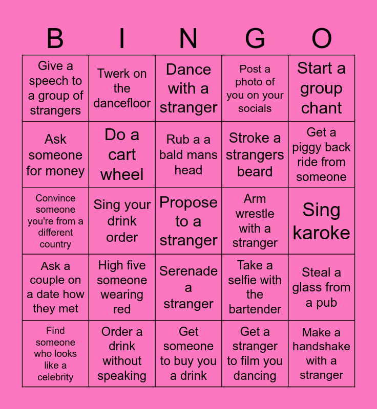 This bingo card has 30 words: Order a drink without speaking, Ask a stranger how babies are made, Sing your drink order, Take a shot with no hands, Give a speech to a group of strangers, Dance with a stranger, Do a cart wheel, Serenade a stranger, Arm wrestle with a stranger, Get someone to buy you a drink, Sing karoke, Propose to a stranger, Get a stranger to film you dancing, Make a handshake with a stranger, Get a piggy back ride from someone, Get someones business card, Take a selfie with the bartender, Ask a couple on a date how they met, High five someone wearing red, Start a group chant, Convince someone you're from a different country, Convince someone to trade drinks with you, Twerk on the dancefloor, Stroke a strangers beard, Ask someone for money, Post a photo of you on your socials, Steal a glass from a pub, Find someone who looks like a celebrity, Rub a a bald mans head and Find someone wering stripes.