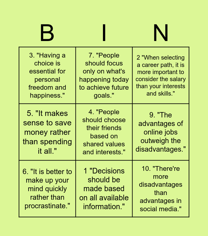 This bingo card has 10 words: 1 "Decisions should be made based on all available information.", 2 "When selecting a career path, it is more important to consider the salary than your interests and skills.", 3. "Having a choice is essential for personal freedom and happiness.", 4. "People should choose their friends based on shared values and interests.", 5. "It makes sense to save money rather than spending it all.", 6. "It is better to make up your mind quickly rather than procrastinate.", 7. "People should focus only on what's happening today to achieve future goals.", 8. "Before making a big decision, consider the potential results.", 9. "The advantages of online jobs outweigh the disadvantages." and 10. "There're more disadvantages than advantages in social media.".