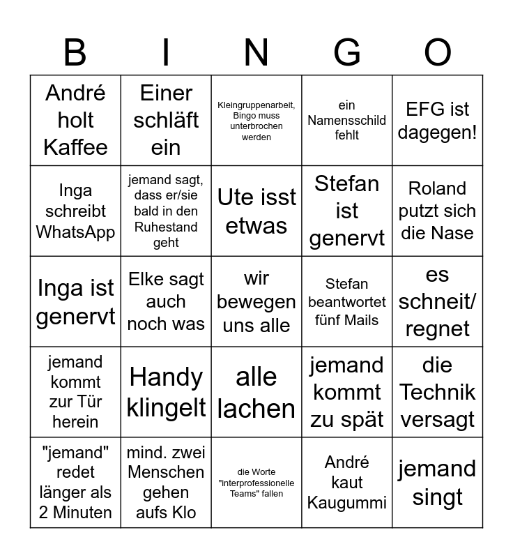 This bingo card has a free space and 24 words: Handy klingelt, mind. zwei Menschen gehen aufs Klo, Ute isst etwas, "jemand" redet länger als 2 Minuten, EFG ist dagegen!, André holt Kaffee, Inga schreibt WhatsApp, Einer schläft ein, Stefan beantwortet fünf Mails, alle lachen, Stefan ist genervt, Inga ist genervt, jemand kommt zu spät, die Technik versagt, jemand sagt, dass er/sie bald in den Ruhestand geht, André kaut Kaugummi, es schneit/ regnet, Kleingruppenarbeit, Bingo muss unterbrochen werden, Roland putzt sich die Nase, Elke sagt auch noch was, jemand singt, jemand kommt zur Tür herein, ein Namensschild fehlt and die Worte "interprofessionelle Teams" fallen.