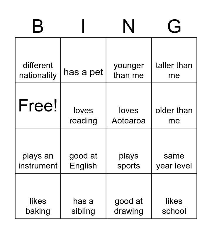 This bingo card has 16 words: has a sibling, same year level, younger than me, different nationality, plays an instrument, has a pet, plays sports, good at drawing, Free!, loves reading, likes baking, taller than me, good at English, older than me, loves Aotearoa and likes school.
