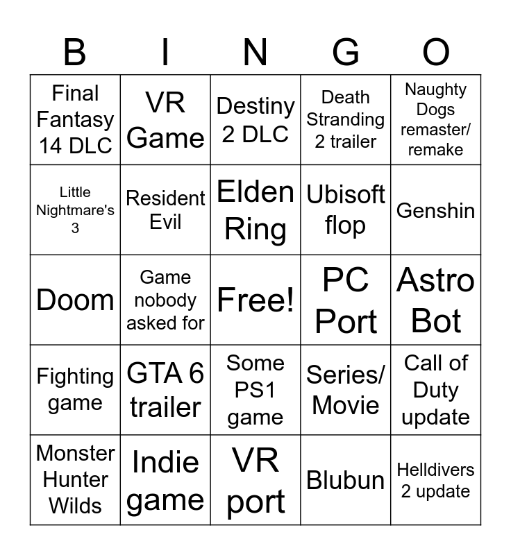 This bingo card has a free space and 24 words: GTA 6 trailer, Indie game, Elden Ring, Monster Hunter Wilds, Naughty Dogs remaster/ remake, Final Fantasy 14 DLC, Little Nightmare's 3, VR Game, PC Port, Some PS1 game, Ubisoft flop, Doom, Series/ Movie, Call of Duty update, Resident Evil, Blubun, Astro Bot, Destiny 2 DLC, Genshin, Game nobody asked for, Helldivers 2 update, Fighting game, Death Stranding 2 trailer and VR port.