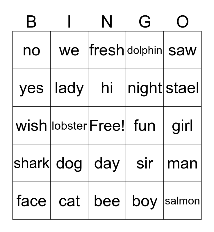 This bingo card has a free space and 24 words: dog, cat, hi, face, saw, no, yes, we, fun, day, night, wish, sir, man, lady, boy, girl, fresh, stael, lobster, salmon, shark, dolphin and bee.