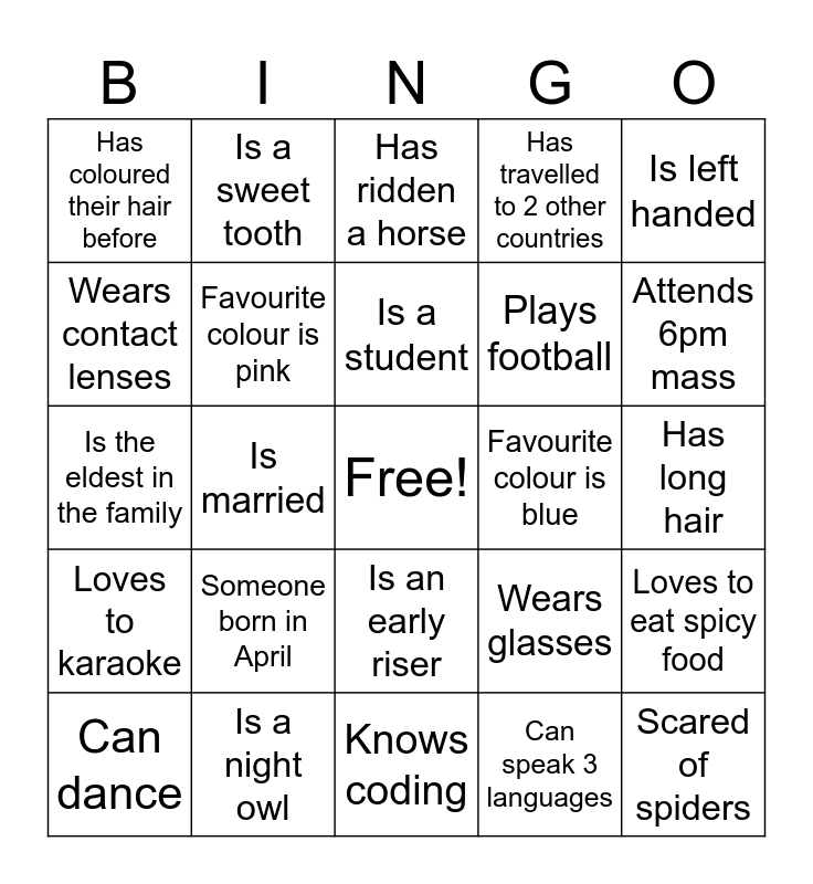 This bingo card has a free space and 24 words: Someone born in April, Is a night owl, Is a student, Can dance, Is left handed, Has coloured their hair before, Wears contact lenses, Is a sweet tooth, Favourite colour is blue, Is an early riser, Plays football, Is the eldest in the family, Wears glasses, Loves to eat spicy food, Favourite colour is pink, Can speak 3 languages, Has long hair, Has ridden a horse, Attends 6pm mass, Is married, Scared of spiders, Loves to karaoke, Has travelled to 2 other countries and Knows coding.