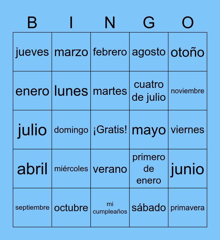 This bingo card has a free space and 27 words: primero de enero, veinticinco de diciembre, cuatro de julio, mi cumpleaños, enero, febrero, marzo, abril, mayo, junio, julio, agosto, septiembre, octubre, noviembre, diciembre, lunes, martes, miércoles, jueves, viernes, sábado, domingo, primavera, verano, otoño and invierno.