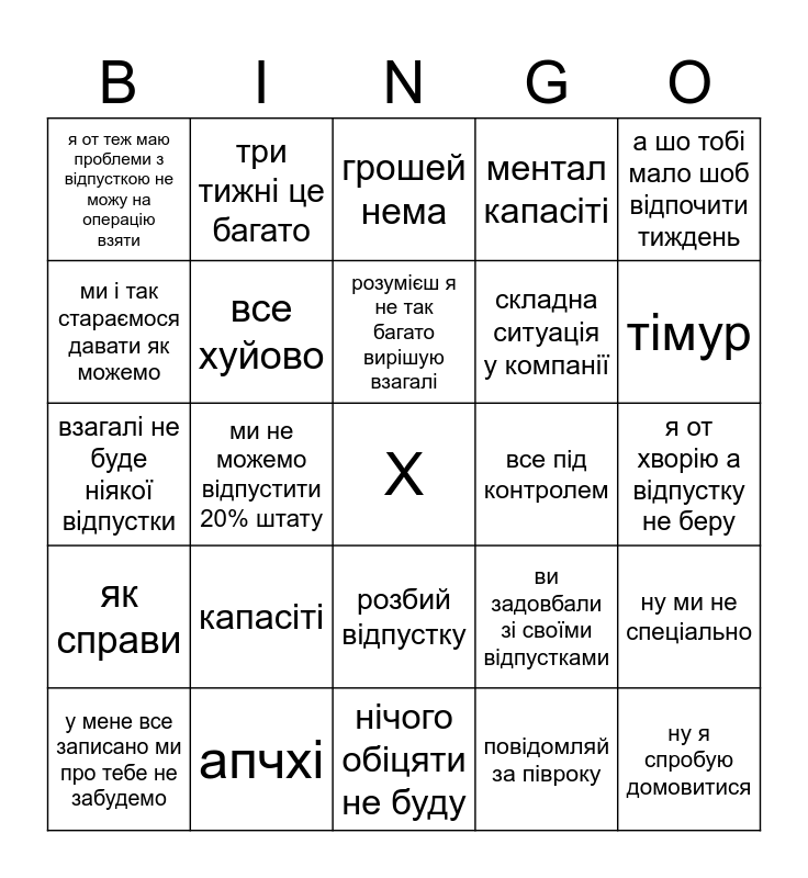 This bingo card has a free space and 24 words: капасіті, апчхі, розумієш я не так багато вирішую взагалі, у мене все записано ми про тебе не забудемо, а шо тобі мало шоб відпочити тиждень, я от теж маю проблеми з відпусткою не можу на операцію взяти, ми і так стараємося давати як можемо, три тижні це багато, все під контролем, розбий відпустку, складна ситуація у компанії, взагалі не буде ніякої відпустки, ви задовбали зі своїми відпустками, ну ми не спеціально, все хуйово, повідомляй за півроку, я от хворію а відпустку не беру, грошей нема, тімур, ми не можемо відпустити 20% штату, ну я спробую домовитися, як справи, ментал капасіті and нічого обіцяти не буду.