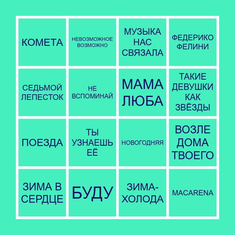 This bingo card has 60 words: БАТАРЕЙКА, ВИДЕЛИ НОЧЬ, ПЛОХАЯ ДЕВОЧКА, MACARENA, КАТЯ, ВОЗЬМИ ТЕЛЕФОН, ФАНТАЗЁР, МАМА ЛЮБА, ЗНАЕШЬ ЛИ ТЫ, ПОЕЗДА, ЮНОСТЬ, ФЕДЕРИКО ФЕЛИНИ, ЦАРИЦА, НЕ ВСПОМИНАЙ, GODZILLA, BEVERLY HILLS, КОМЕТА, ЗИМА В СЕРДЦЕ, СЕДЬМОЙ ЛЕПЕСТОК, НОЧЬ, ТАКИЕ ДЕВУШКИ КАК ЗВЁЗДЫ, БУДУ, МУЗЫКА НАС СВЯЗАЛА, КУКЛА КОЛДУНА, ТЫ НЕ ВЕРЬ СЛЕЗАМ, Я ЭТО ТЫ, О НЁМ, СОЛНЫШКО В РУКАХ, ТОПОЛИНЫЙ ПУХ, ТЫ УЗНАЕШЬ ЕЁ, ТРУДНЫЙ ВОЗРАСТ, GANGNAM STYLE, DESPACITO, I WANNA BE YOUR SLAVE, BEGGIN', НЕВОЗМОЖНОЕ ВОЗМОЖНО, ВЫПЬЕМ ЗА ЛЮБОВЬ, ПЛАЧУ НА ТЕХНО, ВОЗЛЕ ДОМА ТВОЕГО, МАРМЕЛАДНЫЙ, НОВОГОДНЯЯ, ДРУГАЯ ПРИЧИНА, ВСЕ ТАНЦУЮТ ЛОКТЯМИ, ЗИМА-ХОЛОДА, СНОВА Я НАПИВАЮСЬ, ДЕНЬ И НОЧЬ, ПОЖАРЫ, ГЛАМУР, SONG #2, ПРОЩАНИЕ, PEDRO, КРАШ, СОЛНЦЕ МОНАКО, ХЛОПЬЯ ЛЕТЯТ НАВЕРХ, NUMB, КОЛАМБИЯ ПИКЧЕРЗ, КРАСИВАЯ ЖИЗНЬ, НАС НЕ ДОГОНЯТ, МАЛЫШКА, THE FINAL COUNTDOWN and IT'S MY LIFE.
