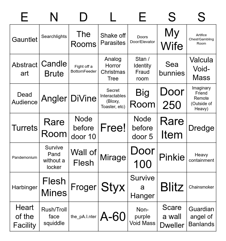 This bingo card has a free space and 53 words: the_pA.I.nter, Sea bunnies, Mindscape man, Node before door 10, DiVine, Heavy containment, Searchlights, Ridge, My Wife, Harbinger, Artifice Chest/Gambling Room, Door 100, Door 250, Big Room, Blitz, Imaginary Friend Remote (Outside of Heavy), Abstract art, Valcula Void-Mass, A-60, Doors Door/Elevator, Stan / Identity Fraud room, Guardian angel of Banlands, Candle Brute, Gauntlet, Non-purple Void Mass, Turrets, Pandemonium, Scare a wall Dweller, Dredge, Fight off a BottomFeeder, Eat a Wall Dweller, Mirage, Survive a Hanger, Chainsmoker, Pinkie, Survive Pand without a locker, Shake off Parasites, Rare Room, The Rooms, Flesh Mines, Froger, Styx, Dead Audience, Flesh Prisnopticloset, Heart of the Facility, Secret Interactables (Bloxy, Toaster, etc), Rare Item, Wall of Flesh, Analog Horror Christmas Tree, Angler, Rush/Troll face squiddle, Node before door 5 and Navi.