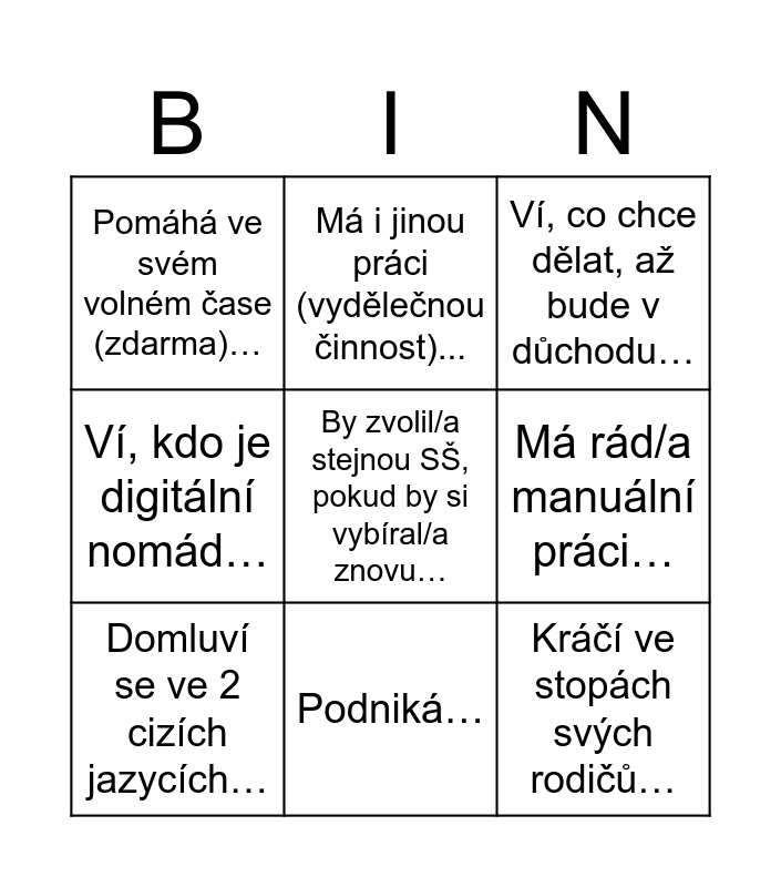 This bingo card has a free space and 13 words: Ví, co bude dělat po škole…(co to bude? :) ), SŠ si vybral sám/a…, Domluví se ve 2 cizích jazycích…, Má i jinou práci (vydělečnou činnost)..., Ví, kdo je digitální nomád…, Kráčí ve stopách svých rodičů…, By zvolil/a stejnou SŠ, pokud by si vybíral/a znovu…, Od mala věděl/a jakou práci chce dělat v dospělosti…, Podniká…, Pomáhá ve svém volném čase (zdarma)…, Má rád/a manuální práci…, Ví, co chce dělat, až bude v důchodu… and Od mala věděl/a jakou práci chce dělat v dospělosti….