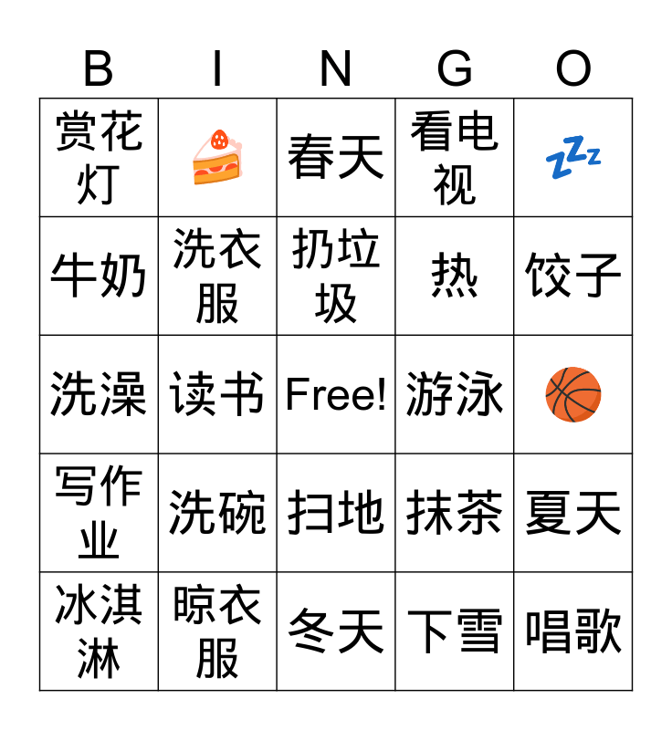 This bingo card has a free space and 41 words: 🍚, 洗澡, 洗脸, 洗衣服, 晾衣服, 扫地, 扔垃圾, 做饭, 💤, 写作业, 读书, 看电视, 唱歌, 🏀, 游泳, 洗碗, 吃汤圆, 赏花灯, 猜灯谜, 春天, 夏天, 秋天, 冬天, 热, 冷, 下雨, 下雪, 包子, 饺子, 意大利面, 面条, 🍰, 冰淇淋, 泰式奶茶, 抹茶, 牛奶, ☕, 可乐, 雪碧, 🍺 and 💖.