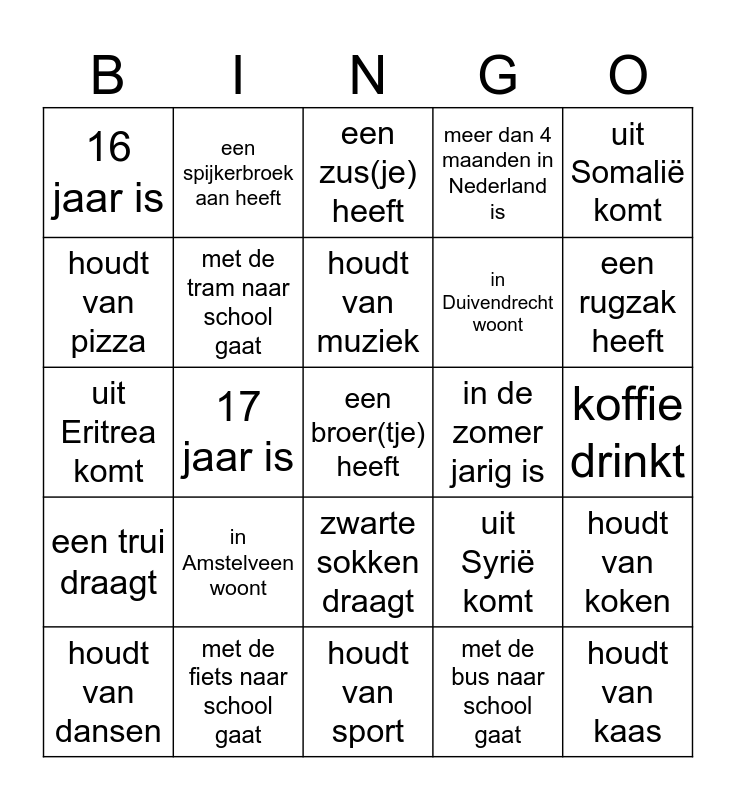 This bingo card has a free space and 24 words: in Amstelveen woont, met de fiets naar school gaat, houdt van muziek, houdt van dansen, uit Somalië komt, 16 jaar is, houdt van pizza, een spijkerbroek aan heeft, in de zomer jarig is, zwarte sokken draagt, in Duivendrecht woont, uit Eritrea komt, uit Syrië komt, houdt van koken, met de tram naar school gaat, met de bus naar school gaat, koffie drinkt, een zus(je) heeft, een rugzak heeft, 17 jaar is, houdt van kaas, een trui draagt, meer dan 4 maanden in Nederland is and houdt van sport.