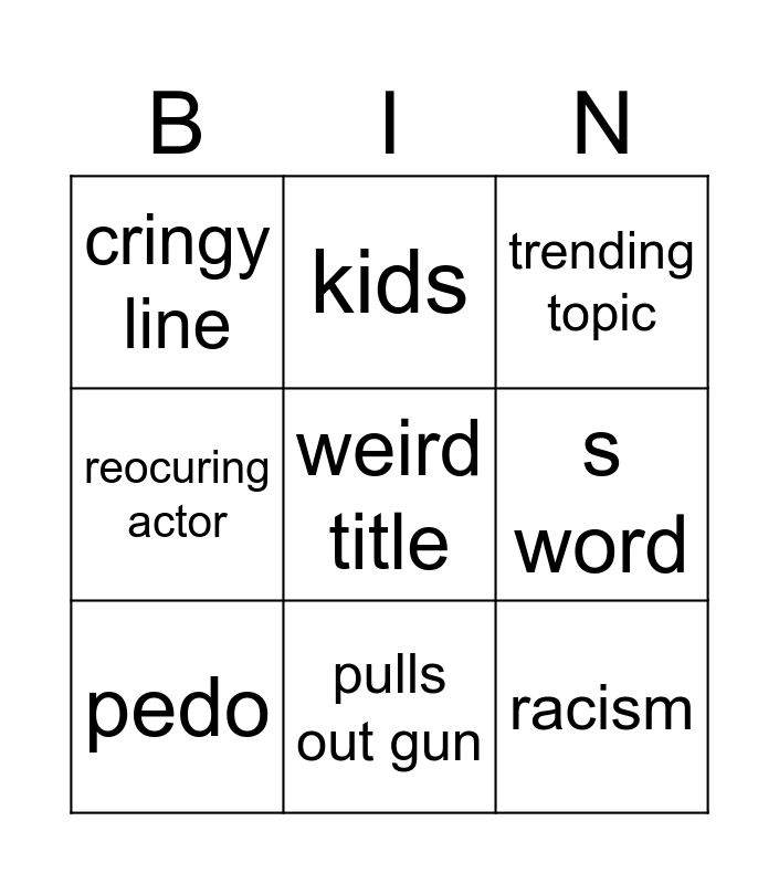 This bingo card has a free space and 8 words: s word, trending topic, kids, pedo, cringy line, racism, reocuring actor and pulls out gun.