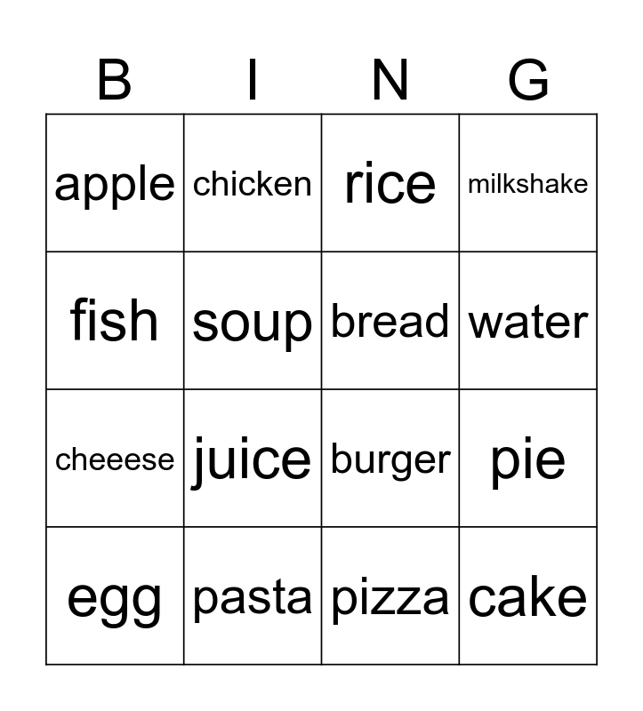 This bingo card has 16 words: pasta, pie, rice, apple, cheeese, chicken, burger, pizza, fish, soup, egg, milkshake, juice, water, bread and cake.