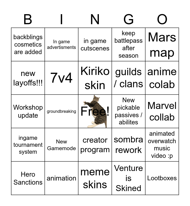 This bingo card has a free space and 24 words: Hero Sanctions, New Gamemode, Kiriko skin, Venture is Skined, Mars map, backblings cosmetics are added, In game advertisments, in game cutscenes, New pickable passives / abilites, Marvel collab, Workshop update, 7v4, sombra rework, animated overwatch music video :p, new layoffs!!!, animation, meme skins, keep battlepass after season, anime colab, ingame tournament system, groundbreaking, creator program, guilds / clans and Lootboxes.