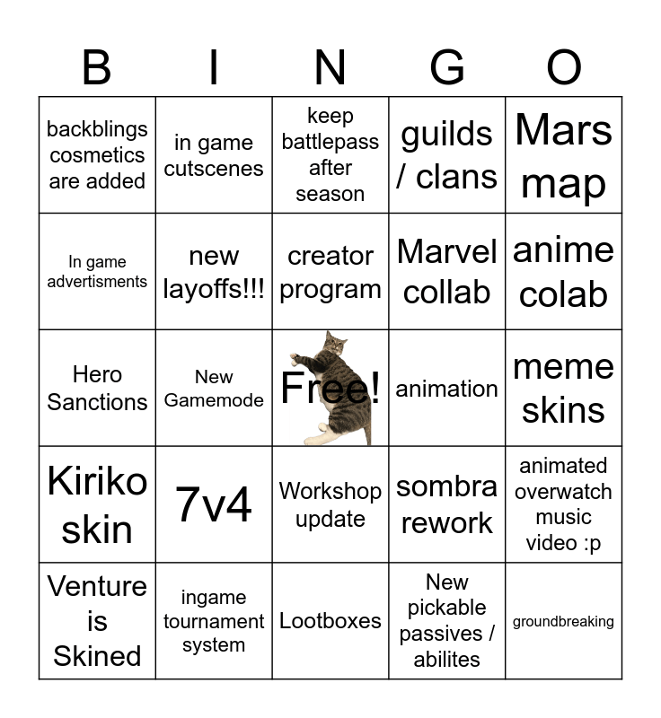 This bingo card has a free space and 24 words: 7v4, ingame tournament system, creator program, Venture is Skined, Mars map, backblings cosmetics are added, In game advertisments, in game cutscenes, animation, Workshop update, Marvel collab, Hero Sanctions, sombra rework, animated overwatch music video :p, new layoffs!!!, New pickable passives / abilites, meme skins, keep battlepass after season, anime colab, New Gamemode, groundbreaking, Kiriko skin, guilds / clans and Lootboxes.