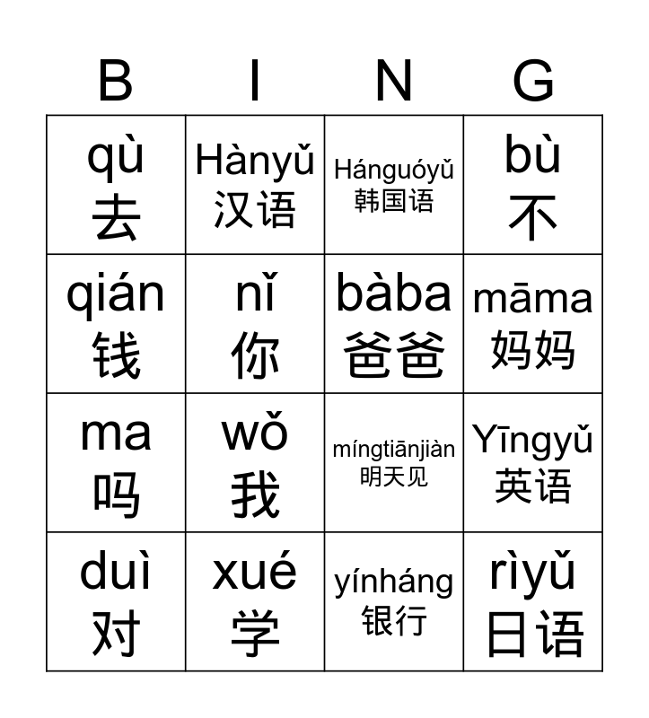 This bingo card has 16 words: xué 学, Yīngyǔ 英语, Hánguóyǔ 韩国语, qù 去, ma 吗, Hànyǔ 汉语, míngtiānjiàn 明天见, yínháng 银行, qián 钱, nǐ 你, duì 对, bù 不, wǒ 我, māma 妈妈, bàba 爸爸 and rìyǔ 日语.