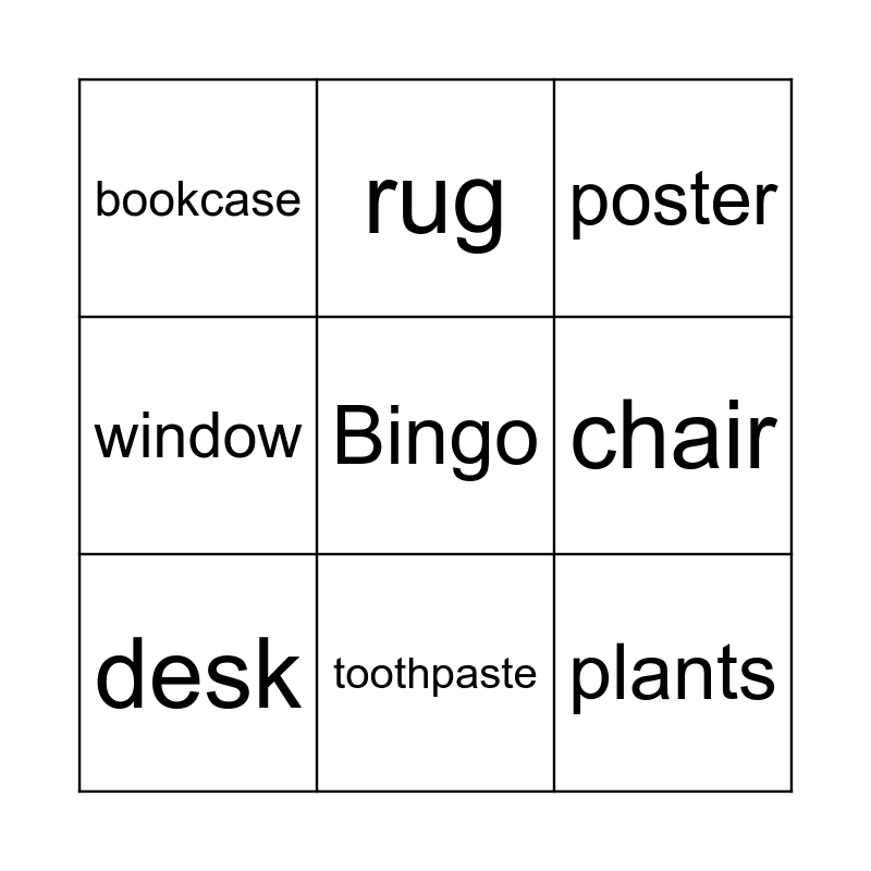 This bingo card has a free space and 18 words: cupboard, table, poster, bookcase, bed, window, door, rug, toothpaste, towel, sofa, plants, cushions, chair, desk, toys, oven and fridge.