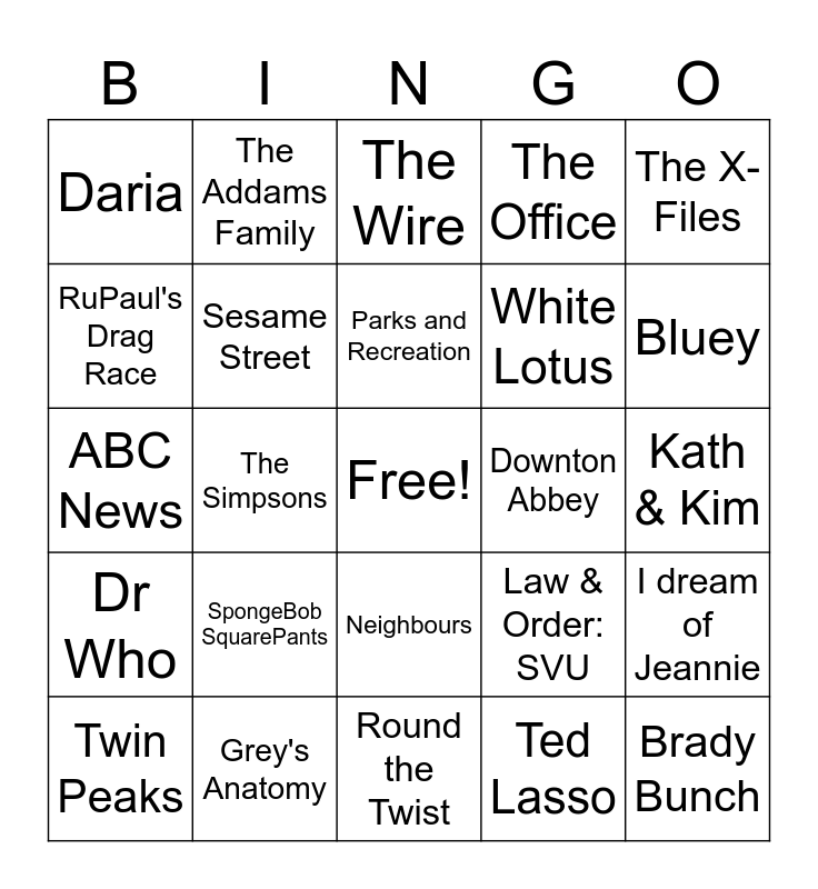 This bingo card has a free space and 34 words: Succession, Ted Lasso, Schitt's Creek, The Fresh Prince of Bel-Air, Dr Who, Sesame Street, The X-Files, Twin Peaks, The Addams Family, Gilmore Girls, Parks and Recreation, The Wire, Antiques Roadshow, The I.T. Crowd, Downton Abbey, Bluey, Grey's Anatomy, ABC News, SpongeBob SquarePants, Law & Order: SVU, Neighbours, Get Smart, Daria, Kath & Kim, Round the Twist, Brady Bunch, The Office, Seinfield, White Lotus, RuPaul's Drag Race, The Nanny, The Simpsons, I dream of Jeannie and Inspector Gadget.