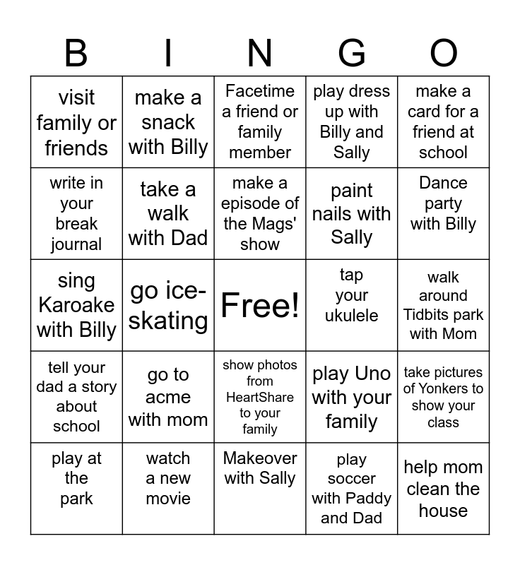 This bingo card has a free space and 24 words: go to acme with mom, watch a new movie, make a episode of the Mags' show, play at the park, make a card for a friend at school, visit family or friends, write in your break journal, make a snack with Billy, tap your ukulele, show photos from HeartShare to your family, paint nails with Sally, sing Karoake with Billy, play Uno with your family, take pictures of Yonkers to show your class, take a walk with Dad, play soccer with Paddy and Dad, walk around Tidbits park with Mom, Facetime a friend or family member, Dance party with Billy, go ice-skating, help mom clean the house, tell your dad a story about school, play dress up with Billy and Sally and Makeover with Sally.
