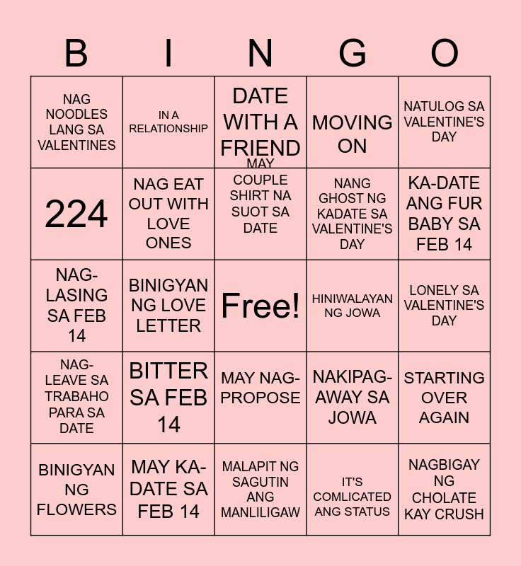 This bingo card has a free space and 29 words: BINIGYAN NG FLOWERS, BINIGYAN NG CHOCOLATE, BINIGYAN NG LOVE LETTER, SINGLE, NAG NOODLES LANG SA VALENTINES, DATE WITH A FRIEND, NAG EAT OUT WITH LOVE ONES, BITTER SA FEB 14, HINIWALAYAN NG JOWA, MAY KA-DATE SA FEB 14, LONELY SA VALENTINE'S DAY, NAGBIGAY NG CHOLATE KAY CRUSH, MALAPIT NG SAGUTIN ANG MANLILIGAW, IT'S COMLICATED ANG STATUS, KA-DATE ANG FUR BABY SA FEB 14, Nag Self-love and Self-care, MAY NAG-PROPOSE, NAG- LEAVE SA TRABAHO PARA SA DATE, NATULOG SA VALENTINE'S DAY, NAG-LASING SA FEB 14, NAKIPAG-AWAY SA JOWA, INAWAY SI BOYFRIEND, NANG GHOST NG KADATE SA VALENTINE'S DAY, 224, MOVING ON, IN A RELATIONSHIP, STARTING OVER AGAIN, MAY COUPLE SHIRT NA SUOT SA DATE and HAPPILY MARRIED.
