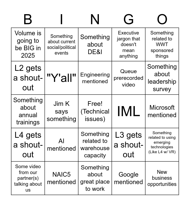 This bingo card has a free space and 24 words: AI mentioned, NAIC5 mentioned, Engineering mentioned, Some video from our partner(s) talking about us, Something related to WWT sponsored things, Volume is going to be BIG in 2025, L2 gets a shout-out, Something about current social/political events, IML, Something related to warehouse capacity, Queue prerecorded video, Something about annual trainings, L3 gets a shout-out, Something related to using emerging technologies (Like L4 w/ VR), "Y'all", Google mentioned, Microsoft mentioned, Something about DE&I, Something about leadership survey, Jim K says something, New business opportunities, L4 gets a shout-out, Executive jargon that doesn't mean anything and Something about great place to work.