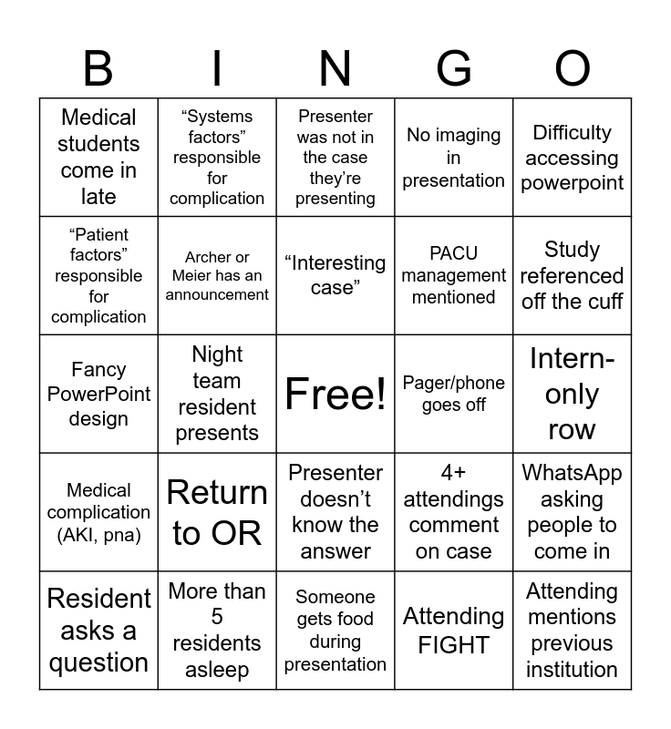 This bingo card has a free space and 29 words: Cooney: “I had a case”, More than 5 residents asleep, Presenter was not in the case they’re presenting, Meier: “doesn’t happen in Peds, but…”, Difficulty accessing powerpoint, Medical students come in late, Archer or Meier has an announcement, “Interesting case”, Pager/phone goes off, WhatsApp asking people to come in, Resident asks a question, Night team resident presents, Attending FIGHT, Attending mentions previous institution, Fancy PowerPoint design, Presenter introduces self & year, Someone gets food during presentation, 4+ attendings comment on case, Study referenced off the cuff, Medical complication (AKI, pna), Return to OR, IR drainage, PACU management mentioned, Intern-only row, “Patient factors” responsible for complication, “Systems factors” responsible for complication, Presenter doesn’t know the answer, No imaging in presentation and “So this was my case…”.