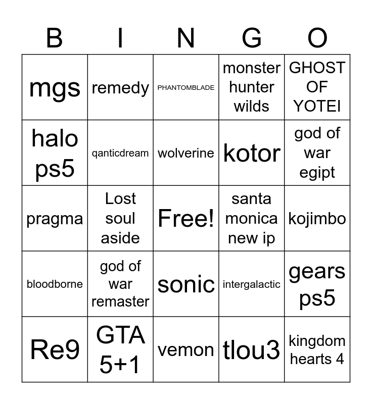 This bingo card has a free space and 24 words: god of war remaster, GTA 5+1, wolverine, Re9, GHOST OF YOTEI, mgs, halo ps5, remedy, santa monica new ip, sonic, kotor, pragma, intergalactic, gears ps5, qanticdream, tlou3, kojimbo, PHANTOMBLADE, god of war egipt, Lost soul aside, kingdom hearts 4, bloodborne, monster hunter wilds and vemon.