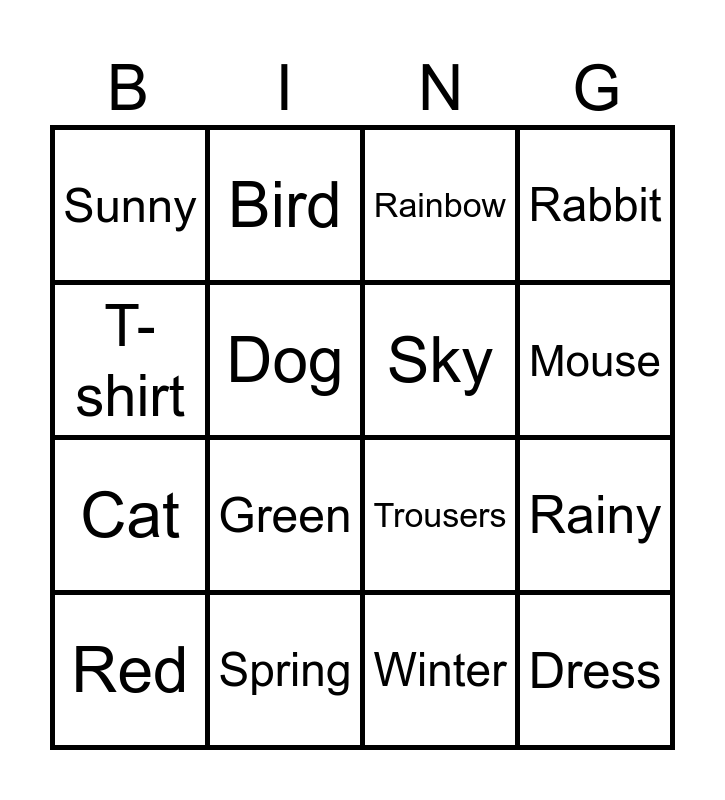 This bingo card has 29 words: Cloudy, Windy, Rainy, Snowy, Sunny, Rainbow, Sky, Autumn, Spring, Summer, Winter, Red, Orange, Yellow, Green, Blue, Purple, Dress, T-shirt, Trousers, Raincoat, Shoes, Cat, Dog, Rabbit, Bird, Goldfish, Mouse and Hamster.
