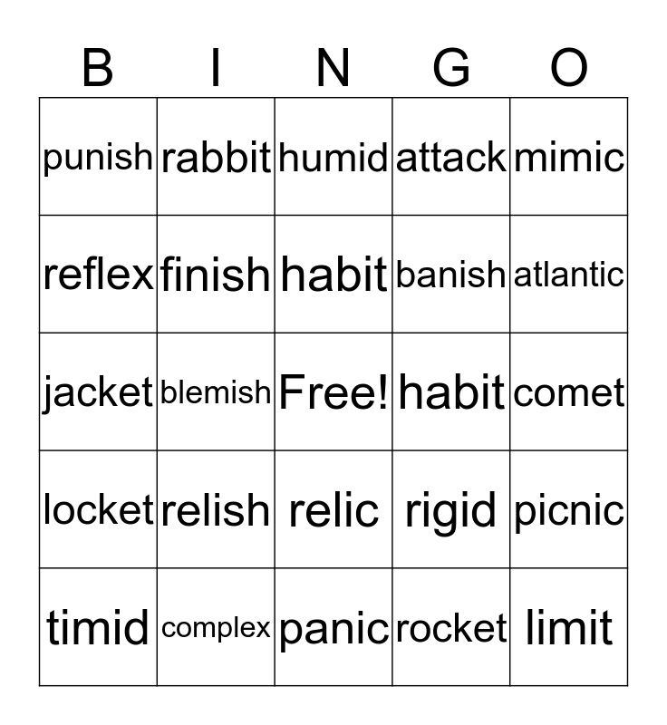 This bingo card has a free space and 24 words: relish, complex, habit, timid, mimic, punish, reflex, rabbit, habit, relic, banish, jacket, rigid, picnic, finish, rocket, comet, humid, atlantic, blemish, limit, locket, attack and panic.
