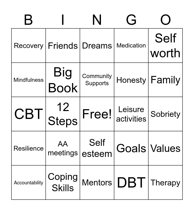 This bingo card has a free space and 24 words: AA meetings, Coping Skills, Community Supports, Accountability, Self worth, Recovery, Mindfulness, Friends, Leisure activities, Self esteem, Honesty, CBT, Goals, Values, Big Book, DBT, Sobriety, Dreams, Family, 12 Steps, Therapy, Resilience, Medication and Mentors.