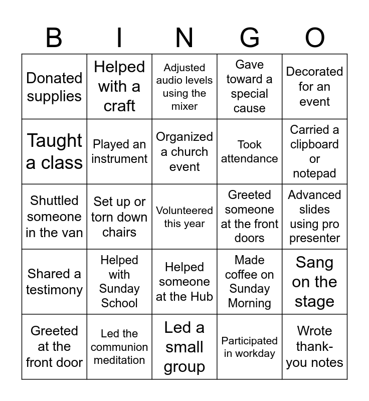 This bingo card has a free space and 25 words: Helped with Sunday School, Led a small group, Organized a church event, Greeted at the front door, Decorated for an event, Donated supplies, Taught a class, Helped with a craft, Greeted someone at the front doors, Helped someone at the Hub, Took attendance, Shuttled someone in the van, Made coffee on Sunday Morning, Sang on the stage, Played an instrument, Gone ‘LIVE’, Advanced slides using pro presenter, Adjusted audio levels using the mixer, Carried a clipboard or notepad, Set up or torn down chairs, Wrote thank-you notes, Led the communion meditation, Shared a testimony, Gave toward a special cause and Participated in workday.